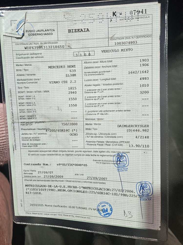 Furgoneta. Color azul. Homologada a 9 plazas, actualmente 6 plazas. Diesel. Del año 2011. Con sólo 141.000 kms. Motor por cadena. Etiqueta medioambiental B. Cambio manual, 6 velocidades. Clasificación 1000 (ITV Anual). Vehículo Nacional.